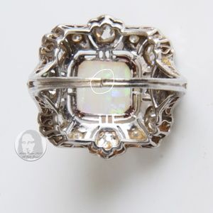 Preowned vintage/antique Art Deco style opal and diamond cocktail ring, likely made in the early 20th C. Made from a platinum setting, it features one large square opal surrounded by 16 round diamonds. A stunning and unique fine jewelry piece that's guaranteed to generate compliments whenever it's worn!