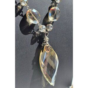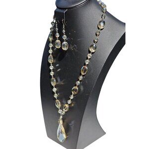 This jewelry set features a stunning crystal bead necklace with a large pendant and matching dangle earrings. Elegant design suited for formal occasions.