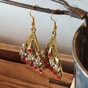Art Deco Egyptian Style Red Pink Austrian Crystal Carved Gold Triangle Earrings