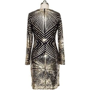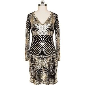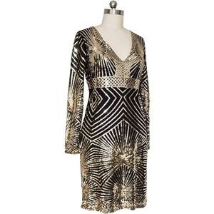 Women's 1920s Flapper Great Gatsby Roaring 20s Vintage Retro V-neck Sequin Long Sleeve Midi Black Gold Dress M NEW