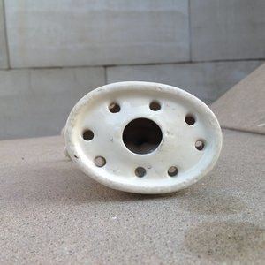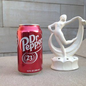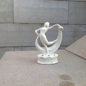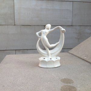A lovely bone white Art Deco Flower Frog, featuring a woman dancing with scarf, atop a pedestal. Measures 6" x 3" x 2". The feeling of movement is awesome an would enhance any flower arrangement, or other independent display.