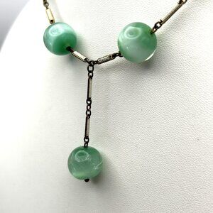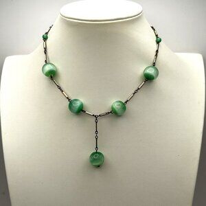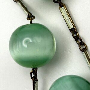 Art Deco necklace dating to the 1920s-1930s. It features glowing green glass beads with a cats-eye effect designed to imitate jade. The chain is composed of elongated rectangular links with white enamel and etched geometric detail, connected by round brass links. The centerpiece has a drop bead for a flattering Y style design.