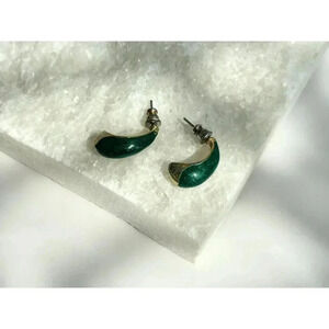 Lovely pair of green enamel teardrop earrings. These have a touch of glitter inside the enamel, the backside is gold colored. Push back enclosure.