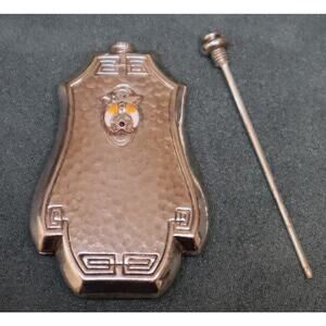 Beautiful hammered texture silver plated perfume featuring the enamel logo of the Shriners philanthropic association on front. Nice Art Deco look and shape with Greek Key design edging. The top unscrews and has an attached wand as shown. Bottle is empty and in great vintage condition with just some light tarnish here and there. Marked "Silver Plate" and measures 2 1/4" high and 1 1/2" wide.