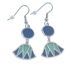 Art Deco Inspired Enamel Drop Earrings in green and navy blue geometric design, perfect for women. Unbranded, these earrings have a silver-plated metal and enamel finish. Size is 1&1/2".