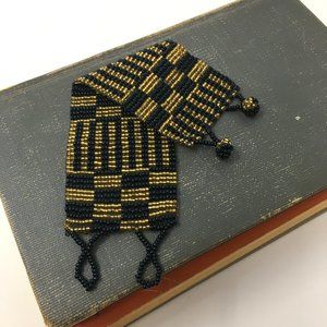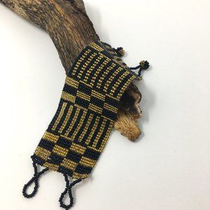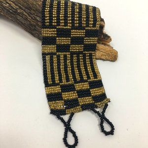 - Hand woven, bold, graphic checkerboard, striped shimmery gold tone and black, wide, seed beaded cuff bracelet