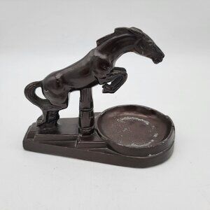 This vintage bronze ashtray features an elegant jumping horse design. It serves as both a functional ashtray and a decorative collectible piece.