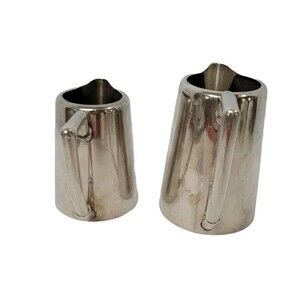 2 pc lot Vintage Meneses-Alpplda Pitchers #2 #4 Art Deco. Vintage pre-owned condition - Unpolished, scratches from use/age, larger pitcher has a crack in inside only - not seen on outside. Silver plated?? AS IS. Please see photos for measurements an condition of pitchers you will receive. Purchased from an estate. I have no history or know metal content. They are heavier than what they should be by size. Questions welcomed anytime.