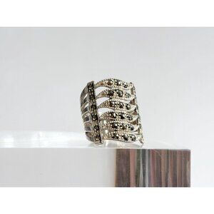 Beautiful and unusual art deco marcasite accented ring. The ring has a tapered shank with 6 rows filled with round cut stones. Shank joins as one at the bottom. Gorgeous ring. Inner shank is marked as sterling, tested positive as such via chemical testing.