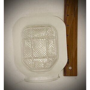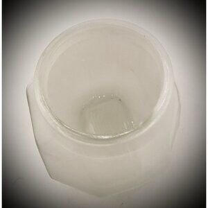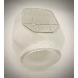 This product is a small, white Art Deco milk glass light globe, featuring a divers helmet shape with a geometric clear grid pattern that adds a touch of Mid-Century Modern style to any ceiling, bathroom, kitchen or porch. Made in the United States in the 1960s, this vintage original piece is a salvage item, adding to its unique and charming appeal. Perfect for those looking to add a touch of nostalgia and elegance to their space, this glass globe is sure to make a statement.