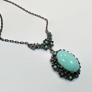 I love Art Deco jewelry! This is a unique vintage 1930s/1940s necklace. This beauty is done with mixed metals as was common during this timeframe. The pendant is set with a large lucite robins egg blue cabochon. Little inset pieces coordinate with it. Now look at the ornate setting. Done in a pot metal, it has many dimensional flowers. It is suspended from a coordinating crescent shaped piece. This is all suspended from a darkened bronze / copper chain and closes with a box clasp. Stunning piece to add to your collection.