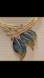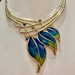 This is a gorgeous art deco nouveau style enamel gold tone statement necklace. It features three bright and colorful leaves and measures 17" with 3" extender.