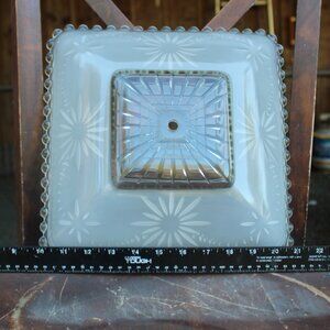 Vintage 1940s satin crystal glass shade from Sears’ Harmony House line. Square flush-mount design with atomic starburst cut pattern. Measures 11 3/8" × 11 3/8". Two-bulb capacity. Originally used in a 1941 guest bedroom. In excellent condition.