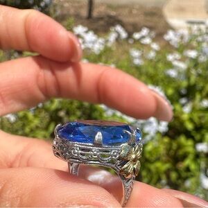 Art Deco Sterling Silver Filigree Ring with Blue Paste Stone & Floral Accents