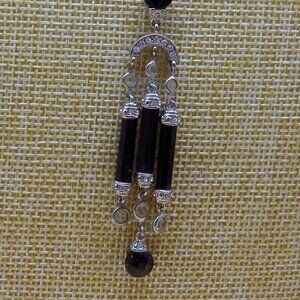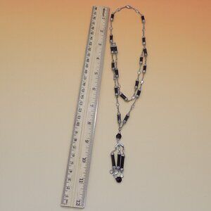 Art Deco Style Black Bead Necklace Silver-tone Clear Stone Station 2 Row Layered