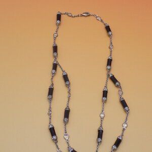 Art Deco Style Black Bead Necklace Silver-tone Clear Stone Station 2 Row Layered