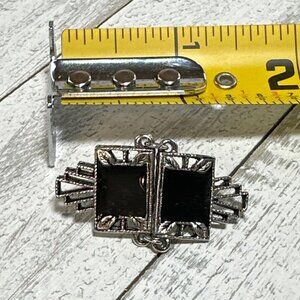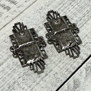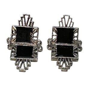 These Art Deco style earrings offer a bold geometric design with black and silver tones. An elegant choice for adding a touch of vintage sophistication to your ensemble.