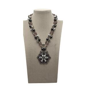 This stunning Art Deco–style necklace features layered strands of smoky gray, black, and metallic faceted beads, all leading to a striking starburst pendant set with brilliant marquise-cut clear rhinestones. The symmetrical design and antique silver-tone setting bring bold 1920s glamour to any outfit.