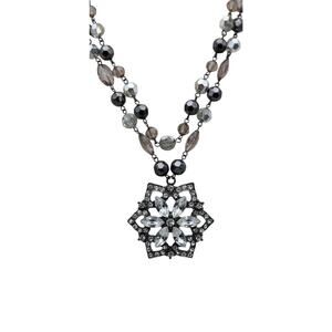 This stunning Art Deco–style necklace features layered strands of smoky gray, black, and metallic faceted beads, all leading to a striking starburst pendant set with brilliant marquise-cut clear rhinestones. The symmetrical design and antique silver-tone setting bring bold 1920s glamour to any outfit.