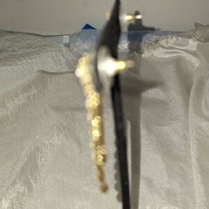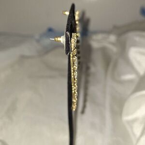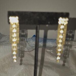 This is a gorgeous pair of Art Deco style women's earrings. They are mostly a gold tone with a rhinestone focal point at the top and a line of clear rhinestones that goes down the middle of the dangle. These are very elegant and would be great for a cocktail party or evening event. They are approximately 2.25" long and in good pre-owned condition. They have a stud post closure and do need some cleaning on the backs.