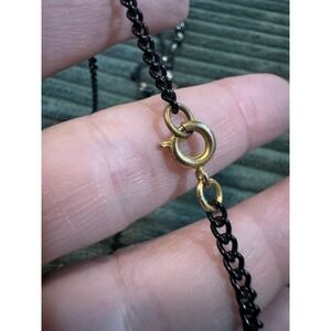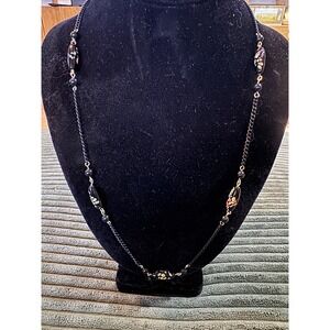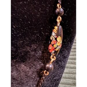 Exquisite vintage beaded necklace showcasing a unique and elegant design. This antique necklace features a black chain adorned with complementary beads and ornate millifiori glass accents, celebrated for their delicate floral patterns. The construction of the piece lends itself to a refined aesthetic, perfect for adding a touch of timeless sophistication to any ensemble. The necklace is secured with a simple clasp, ensuring ease of wear while maintaining a classic silhouette.