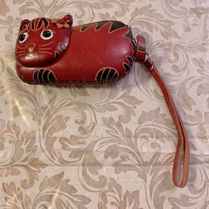 Art Design Red Stiff Leather Kitty Cat Small Mini Coin Purse Gorgeous