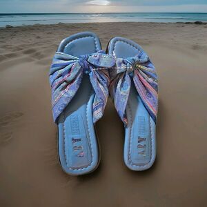 The Art Effects Slide On Sandal in size 6 features a striped pattern with a blue multicolor design, perfect for a beach party theme. With a low wedge heel and slip-on closure, these sandals are comfortable and stylish for casual, party, or travel occasions. Made with polyester upper material and rubber outsole, these sandals are the perfect addition to your summer or spring wardrobe. The bow accent adds a touch of flair to these 90s-themed slides from the brand Art Effects.