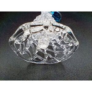 This vintage hand-blown glass bell showcases a delicate clear body with intricate patterns and a charming blue bird topper. A timeless collectible.