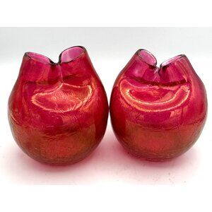 Art Glass Blenko? Pinched Vase Crackle Vintage Red Gold Florescent. Measures 5 x 4.5 inches. Perfect for flower arrangements and home decor. Set of 2.. See photo 4. There is a mark under the glass that might be a small breakage although I cannot feel it.
