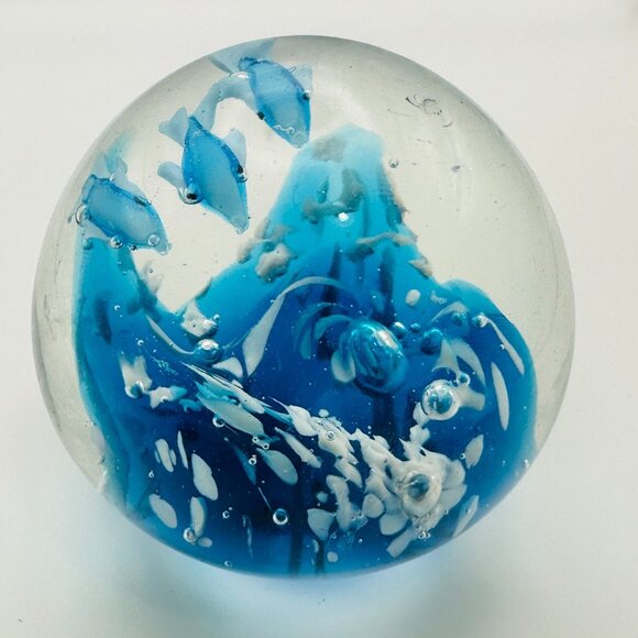 Art Glass Clear Round Paperweight with Controlled Bubbles Waves 3 Blue Dolphins
