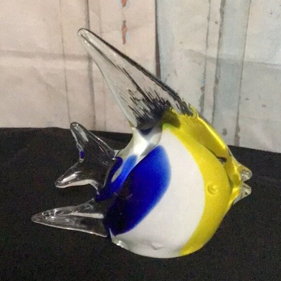 Art Glass Fish Sculpture Paperweight Multicolor Yellow Blue White