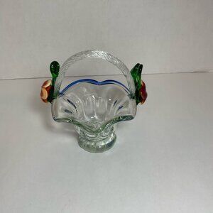 Art Glass Fluted Basket with Handle Applied Red Flowers Vintage Studio Creation