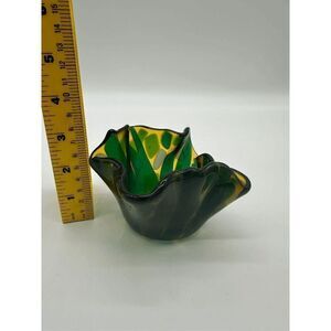 Art Glass Handkerchief Hand Blown Glass Ruffled Rim Signed- Green & Yellow