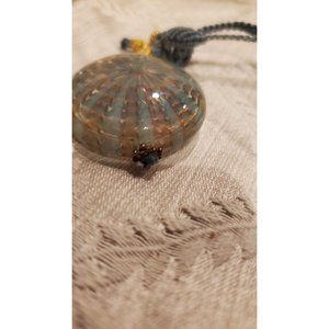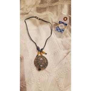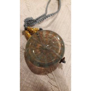 Art Glass Jewelry Necklace 8" neck with braided cord with a loop closure s hook. 11 inch in length with glass pendant. The glass pendant is 1.5 inch in diameter. The cord is tied off with goldtone stacked beads.