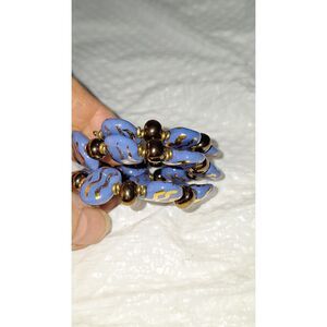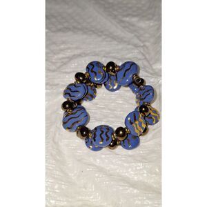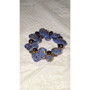 This is a really nice looking piece of memory wire jewelry. It consists of chunky ceramic painted pieces separated by dark bronzy round beads. The ceramic pieces have a metallic gold paint in a wavy pattern over the country blue color. This piece is different and unique and in nice pre-owned condtion.