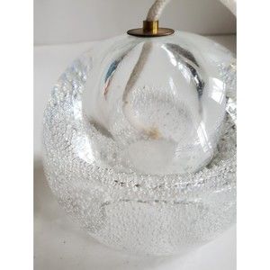 This is a beautiful round art glass ornament type oil lamp. Does not appear to have ever been used. The glass is clear with applied bubbles. There is no maker's mark that I can see. the bottom is open and does have some wear around the base, but no other visible damage. It is approximately 3 3/4 " tall. Very pretty to look at, pictures do not do it justice. This would make a great decor piece for those who collect glass.