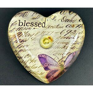 This heart shaped paperweight evokes a sense of nostalgia with its vintage inspired script, butterfly motif, and "Blessed" inscription. The glass construction adds an elegant touch, making it a timeless desk or decor piece and collectible.