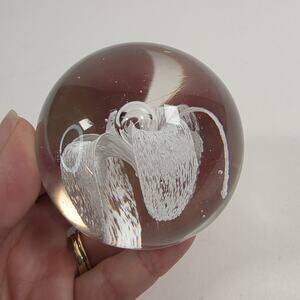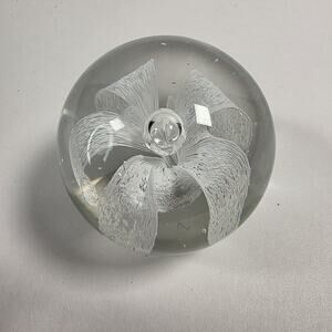 Art Glass Paperweight In Clear with White Flower unsigned desk decretive piece