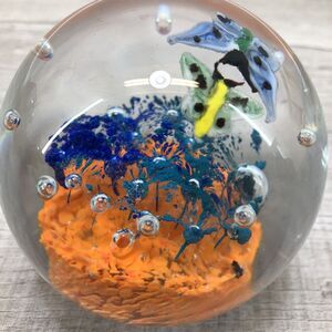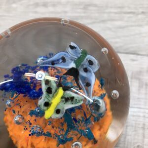 This art glass paperweight features a beautiful design of org/blue/yllw trees and blue/green butterflies with black spots. Handmade with a decorative art deco style, this clear glass piece is a unique and vintage addition to any collection. The intricately hand-blown details and artistic flair make it a standout item for any home decor enthusiast or collector of decorative pottery and glassware.