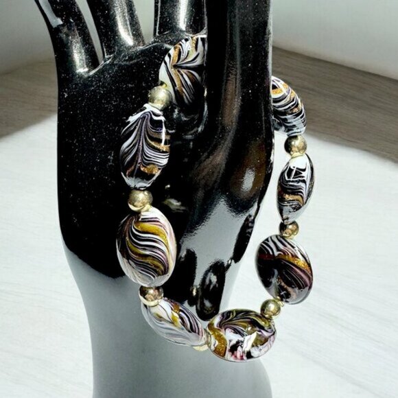 Art Glass Round Penny Beads Bracelet Stretchy Gold Black White