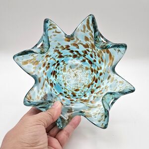 Striking! Art glass bowl dish with deep ruffle edges with robin egg blue aqua brown speckles splatters. Smooth bottom. Murano-like style. Star fish. Thick heavy glass.