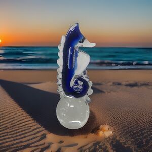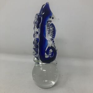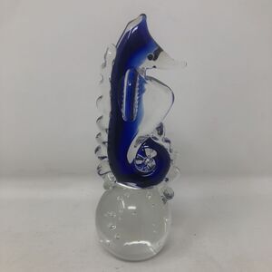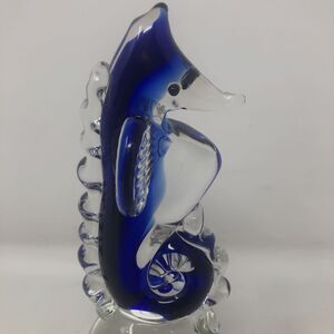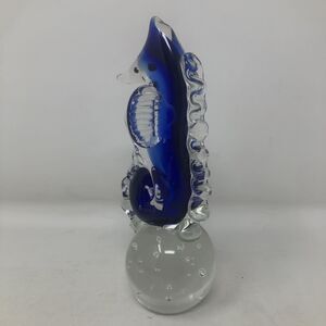 Art Glass Seahorse Paperweight Cobalt Blue Bullicante Bubbles 7" Beachy Coastal