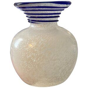 This striking blown glass vase features a wide, flared mouth with vivid cobalt blue swirled stripes that wrap dramatically around the neck. The body has a speckled, milky-white appearance that diffuses light beautifully and adds depth to its translucent form.