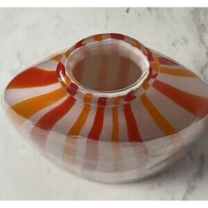 Vintage Art Glass Vase White Orange Red Vertical Stripes Casing Decorative Flask Shaped Bottle