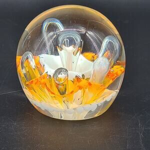 Art Glass White Orange Florals Controlled Bubbles Paperweight