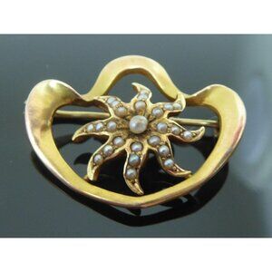 Art Nouveau 14K Gold Brooch With Starfish & Pearl Design