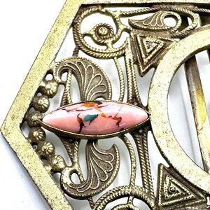 Now THIS is a conversation piece. Substantial Art Nouveau period belt buckle featuring three natural rhodonite or rhodochrosite cabochons with distinctive pink coloring and natural matrix inclusions. The elaborate brass framework showcases characteristic Art Nouveau elements including flowing scrollwork, stylized foliate patterns, rope-twist borders, and geometric accents. Easily convertible to a statement pendant or brooch.