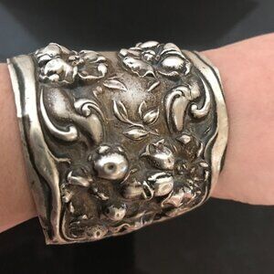 Thanks for looking at this stunning handmade one of a kind totally luxurious bracelet made with antique solid sterling silver from the art nouveau era. The motif in high relief repousse floral and baroque