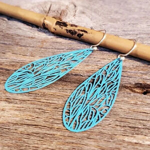 Art Nouveau Lacy Turquoise Blue Filigree Slim Teardrop Enamel Pendant Earrings