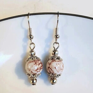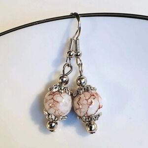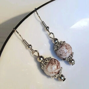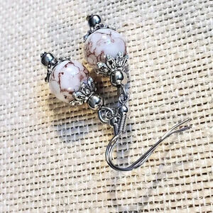 Art Nouveau Mottled White Brown Glass Beads Antiqued Silver Earrings